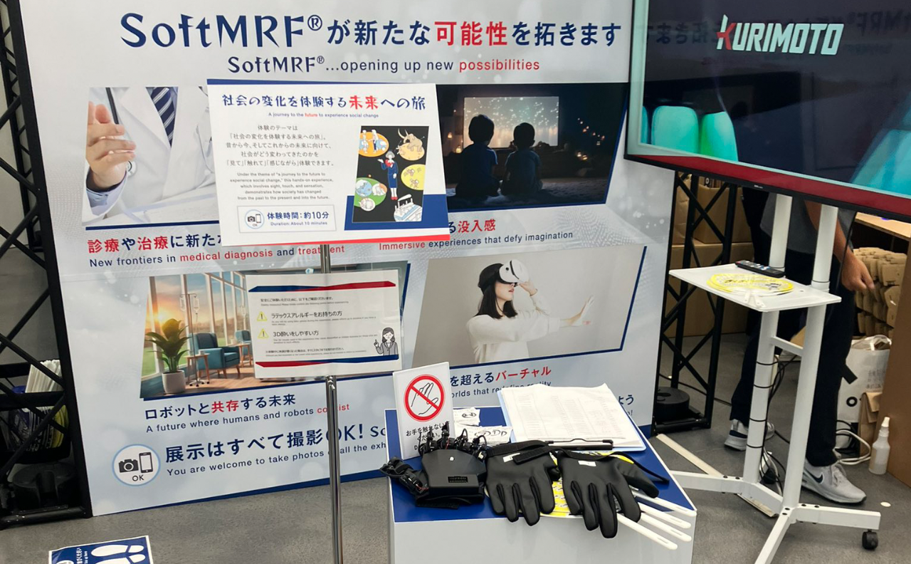磁気粘性流体(MRF)を用いたグローブ型の専用デバイスを装着することで、空中ディスプレイに映し出された商品(果物や枕など)の質感・触感を、実際にその場にあるかのように体感することができます。