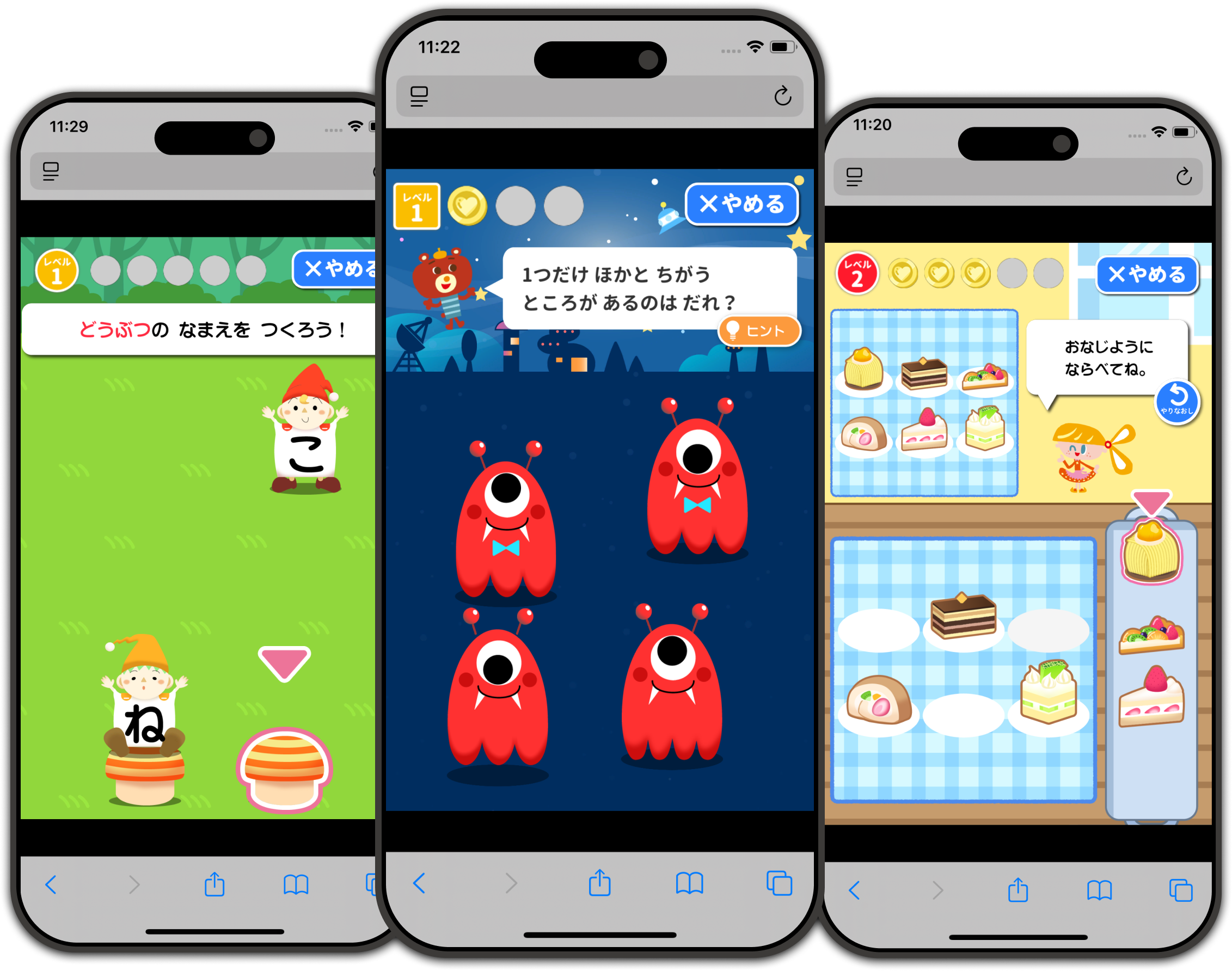 色や形、すうじの数え方や単位など、幼児教育におけるさまざまな分野について、ゲームアプリを通じて楽しく学べます。